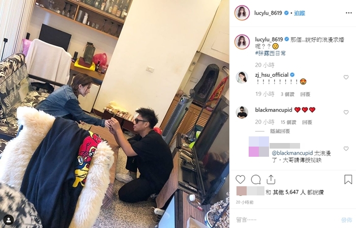 Lucy時常在IG放閃,日前她貼出一張有關黑男的照片,只見黑男一如往常的裝扮,不一樣的是他單膝下跪,手中似乎拿著一樣東西,畫面看起來就像是在求婚!而Lucy的貼文也寫下,「那個…說好的浪漫求婚呢??」照片加上文字,讓粉絲十分震驚,難道兩人好事將近?