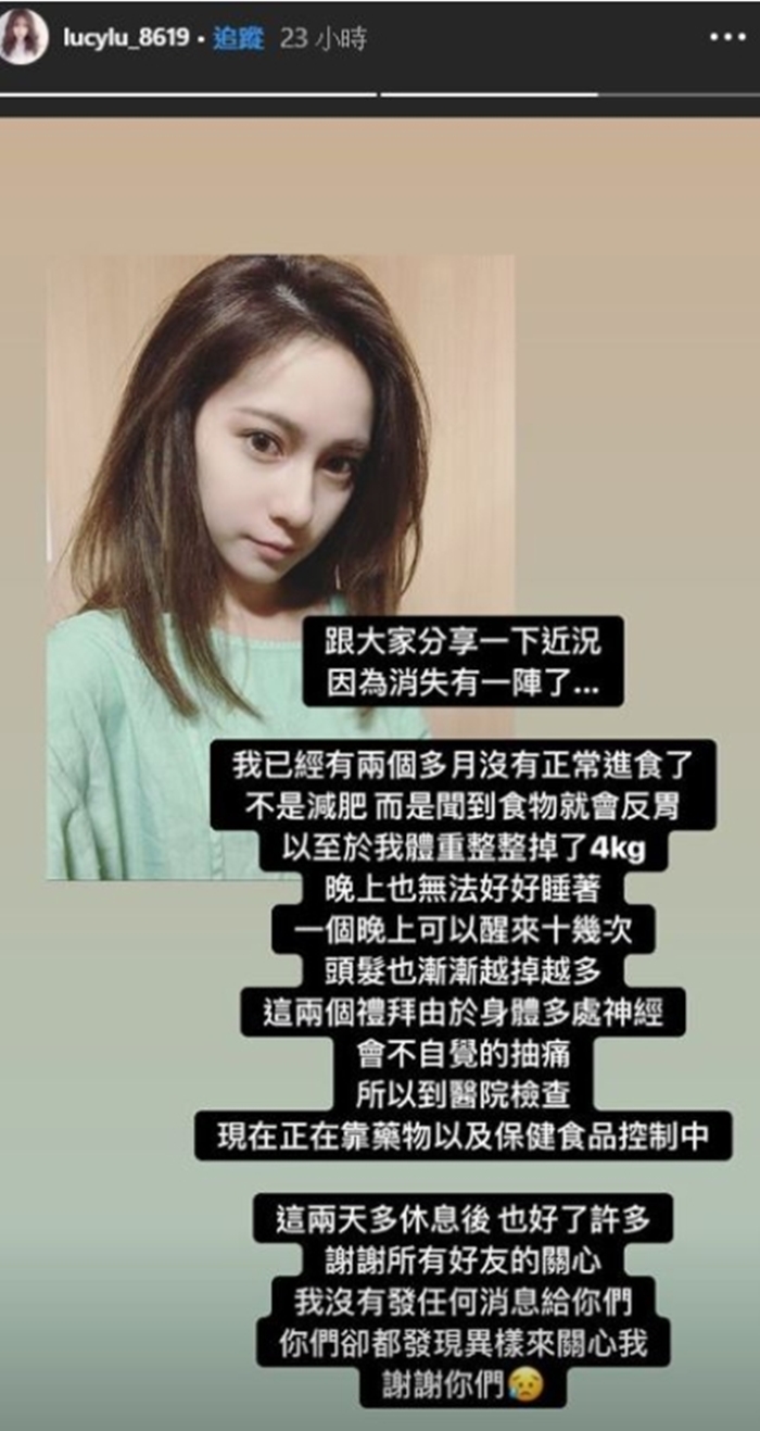除了感情狀況以外,網友們也十分關注Lucy的身體狀況,日前她消失了一段時間,之後也坦言自己「兩個多月沒有正常進食」、「晚上無法好好睡著」、「身體多處神經不自覺抽痛」,當時也以藥物、保健食品控制中,身體也漸漸好轉中,喊話粉絲不用擔心。