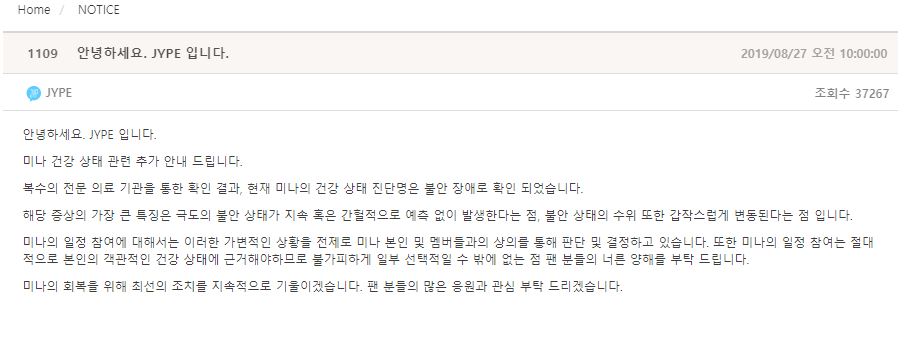 近期TWICE才隔5個月又將在9月底光速回歸,關於Mina能否歸隊外界也相當關心,對此,聲明稿中也解釋由於焦慮症會不定期且突然發作,因此還是會依照Mina個人的身體狀況決定能否重回螢光幕前,外界仍然相當期待9人再度同台。