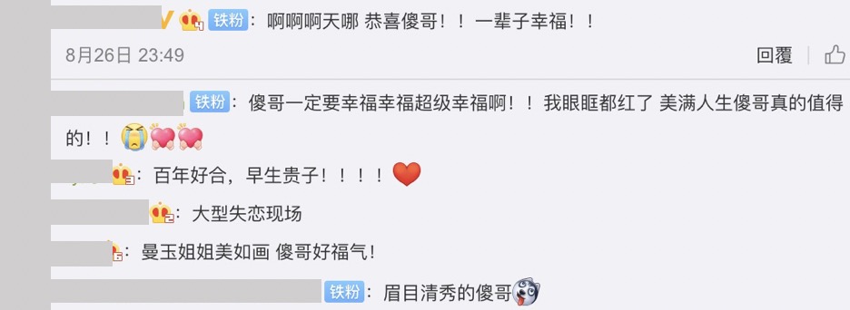過去大傻在微博上也鮮少公開女友的照片,在目前大傻設置公開的照片中並沒有女友的任何照片,這次曬出結婚照堪稱是在他目前的微博貼文中首次出現女友,而網友們看見大嫂的照片後也紛紛留言:「啊啊啊天哪 恭喜傻哥!!一輩子幸福!!」、「眉目清秀的傻哥」、「百年好合,早生貴子!」、「曼玉姐姐美如畫 傻哥好福氣!」,對於大傻老婆的顏值網友們也都相當驚嘆。