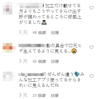 許多網友看到照片之後紛紛讚嘆她的修圖技術「心裡的陰影面積擴大了」、「完全是男人和女人的差別」、「為這個技術嘖嘖稱奇」但也有網友留言表示「100分」釣出她本人回覆「左邊的我也可以嗎」讓不少網友大讚「左右兩邊都很正」、「左邊更貼近一般人」、「右邊反而不自然」、「相當可愛啊」。