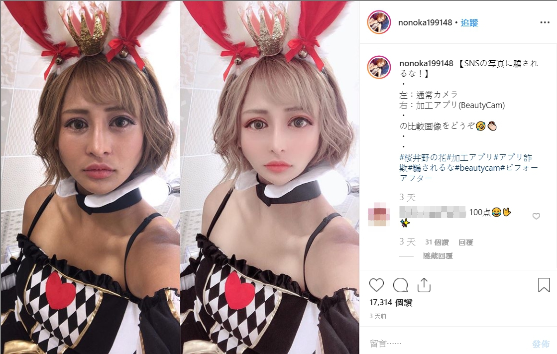 櫻井小姐近期除了經營夜總會外,還活躍於日本節目和Youtube中,她的頻道「桜井野の花TV」經營不到1年,就有超過12萬的粉絲訂閱,喜愛分享的她經常在社交網站上傳自己的美照,照片中的她皮膚被淺色的頭髮襯得十分白皙,有一雙水汪汪的大眼睛,帶著日本女性特有可愛氣質,風格十分多變,但是她在23日分享一張自己修圖前後的對比照,表示「不要被SNS的照片欺騙了!」