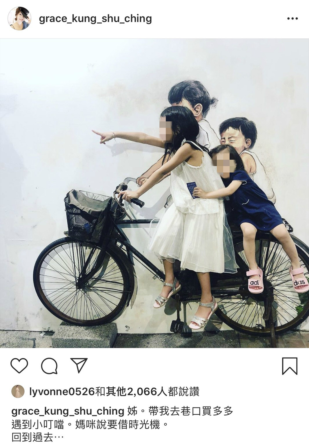 Grace也在阿翔復工後曬出甜蜜合照,還在貼文寫著:「總有人說,生命是單行道,儘管快樂與痛苦終將無法重新來過;我說,生命是雙向道,一方手裡抓著幸福,另一方式持續創造它。」接著又在IG曬出兩個孩子坐在腳踏車上的照片:「姊,帶我去巷口買多多,遇到小叮噹,媽咪說要借時光機,回到過去…」雖然一連PO出好幾張一家人的幸福合照,昨(26)日又PO出一家人出遊住民宿的照片,Grace還穿著粉色蕾絲的性感睡衣入鏡,但不難感覺到,Grace內心仍是痛苦的,不過也證明阿翔正在努力地修補關係。