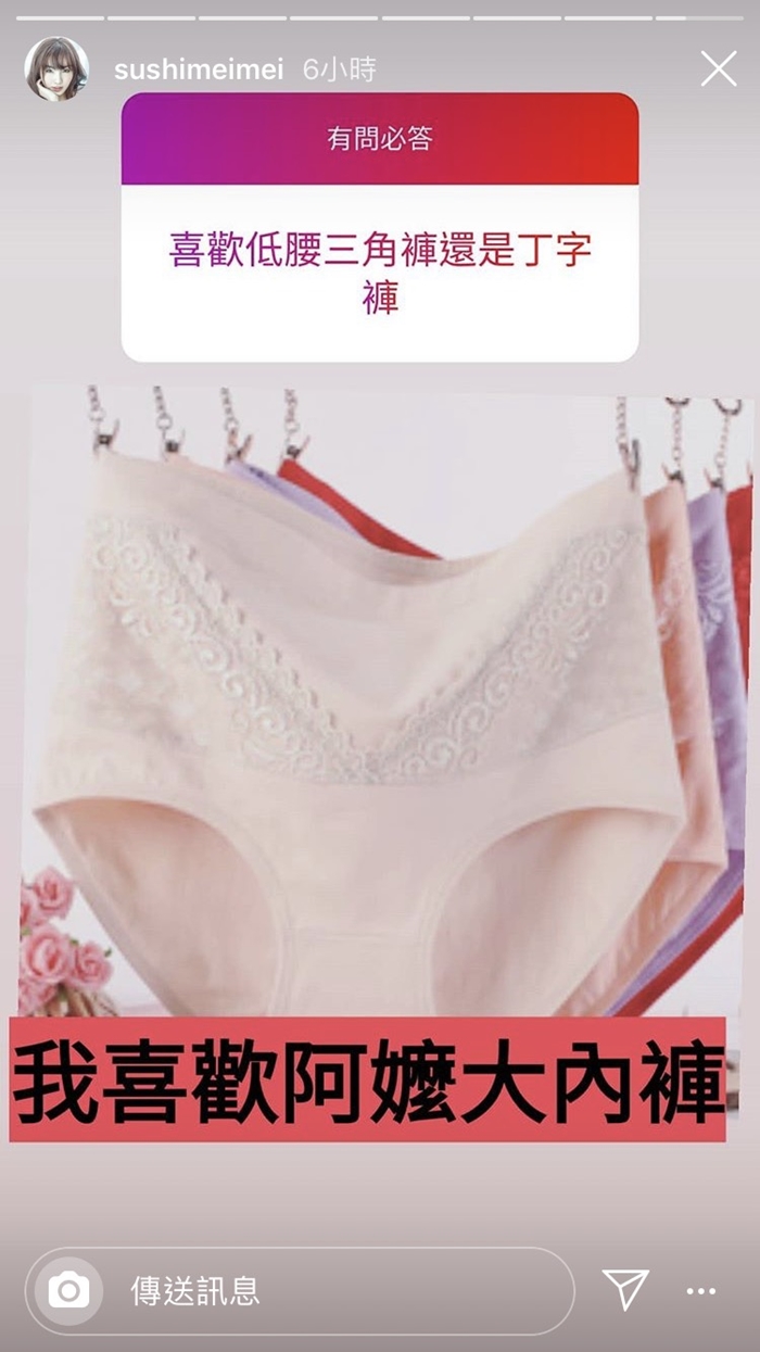壽司日前在Instagram上大玩問答遊戲,同時還承諾「有問必答」,沒想到有網友想趁這個機會挖壽司的隱私,因此詢問她「喜歡低腰三角褲還是丁字褲?」幽默的壽司沒被問題問倒,反而有趣的貼出內褲照直呼,「我喜歡阿嬤大內褲」!