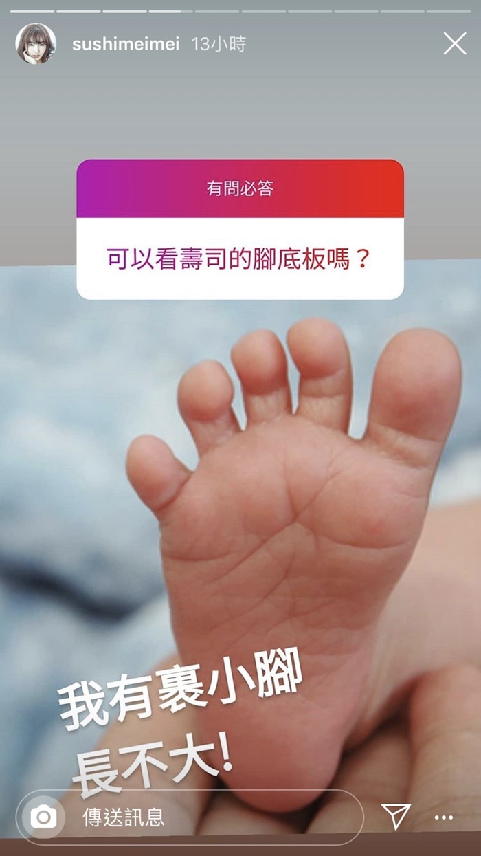 除此之外,壽司也持續用幽默的方式,回擊網友給的隱私問題,當有人想看壽司的腳底板時,壽司直接貼出「小腳」照片,搞笑地寫下「我有裹小腳,長不大」,對於擊退奇怪問題十分地在行。