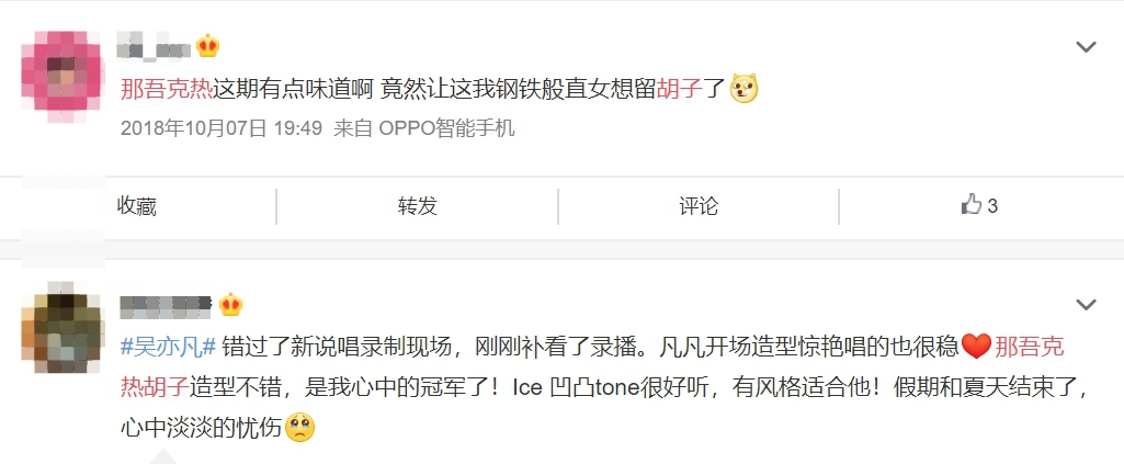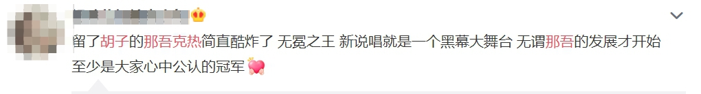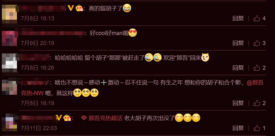 事實上,這已經不是那吾克熱第一次因為蓄鬍引起粉絲關注,當時他仍在中國新說唱比賽的時候,也曾因為留了一把「小鬍子」引起粉絲熱議,不少粉絲直誇他適合留鬍子「留了鬍子的那吾克熱簡直酷炸了!無冕之王」、「那吾克熱這期有點味道啊,竟然讓這我鋼鐵般直女想留鬍子了」、「那吾克熱鬍子造型不錯」。