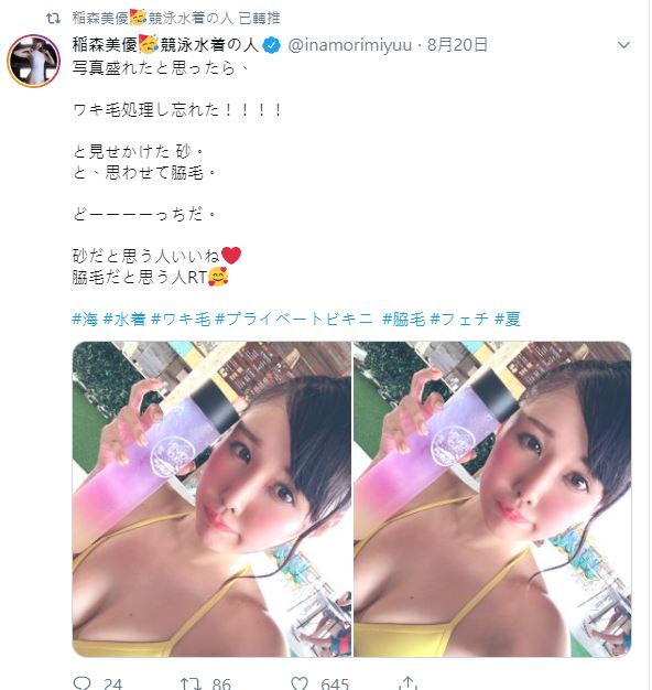 然而如此勤於保養的稻森美優,20日竟在個人推特公開一張「露毛照」。當時他和友人前往海灘度假,當天也穿著黃色比基尼並手拿一杯冰飲自拍,沒想到事後竟發現腋下有一搓黑影,然而稻森美優也機智自嘲「如果你認為是沙那就按讚,如果覺得是腋毛就轉分享吧」。