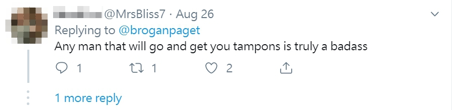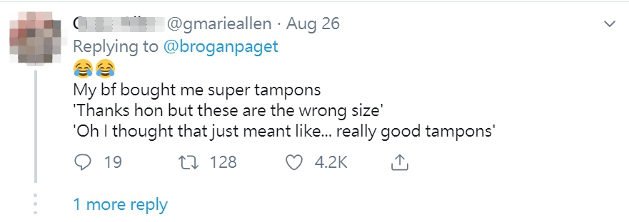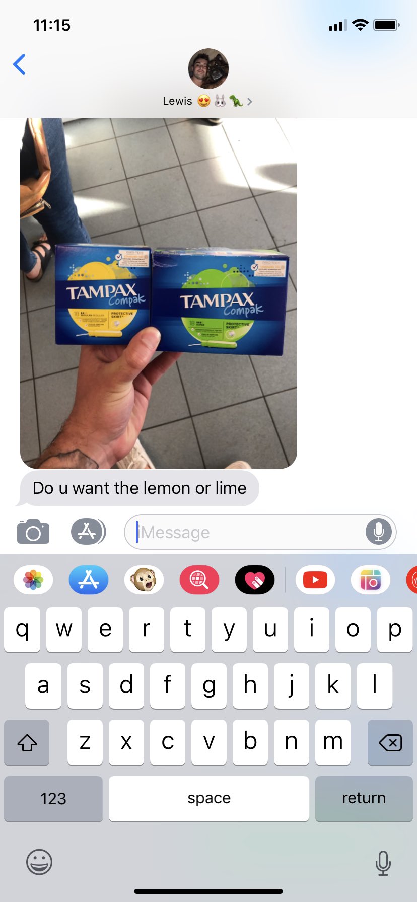 近日,有一名網友伯根(Brogan暫譯)在社群網站上分享男友幫自己買衛生棉時發生的趣事,引發廣大的迴響,吸引了超過90萬粉絲按讚。伯根在網上分享一張和男友的簡訊對話截圖,配上文字「當妳拜託男朋友幫妳買衛生棉條時」,圖片中男友傳了2盒不同顏色的衛生棉條,詢問伯根「你要檸檬或萊姆?」,但事實上,這兩盒衛生棉條的不同來自於尺寸差別,一盒是黃色的普通棉塞盒子,另一盒則是超大號的綠色盒子。