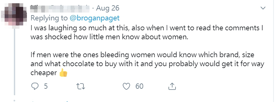網友看到這則貼文之後除了笑瘋之外,也深感共鳴並瘋狂轉傳,紛紛表示自己有切身感受「我男朋友買了超級衛生棉給我,我和他說這是錯誤的尺寸,結果他跟我說這看起來就像超級棒的衛生棉」、也對於男生對於女生的了解甚少感到十分震驚「認真?」、「我看到笑個不停,但是看完一大串評論之後,真的被男生對於女生的淺薄認識嚇到了!」但也有網友表示羨慕,稱「男朋友願意幫忙買衛生棉條就是很幸福的事情了!」、「如果我遇到這麼有趣的男人絕對會嫁給他」、「他真的是一個好男人」。