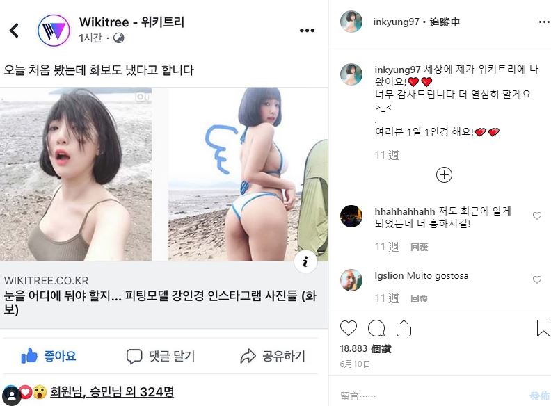 事實上,姜仁卿時常因為不少大尺度的畫面登上新聞版面,像是6月中,姜仁卿曝光在海邊拍照的影片,隨著海風網正面吹拂,姜仁卿身上的單薄背心也因此緊貼在身上,就被眼尖的網友發現,姜仁卿沒穿內衣胸前凸起的「葡萄乾」十分明顯,此外另一則單穿比基尼的貼文則被指出泳褲前後穿反,由於緊貼住私密部位網友才害羞表示「形狀都跑出來了。」顯見姜仁卿不僅外表清純也不忌諱展現好身材。