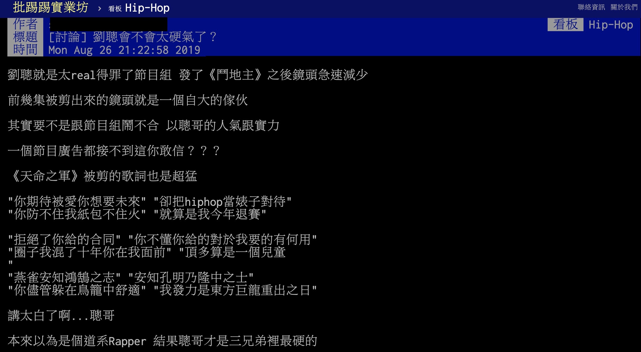目前《中國新說唱》第二季比賽進入倒數階段,在上週節目上集淘汰了兩位實力派選手:劉聰與劉炫廷,造成鄧紫棋戰隊直接團滅,而在下集節目邀請到四位幫唱嘉賓前來助陣演出,同時也淘汰了潘瑋柏戰隊的肖恩恩,全國前四強正式誕生。然而當劉聰被淘汰後也引起許多網友的不滿,大部分的人都認為劉聰第一輪演唱《黃土高坡》表現確實較為優異,在26號PTT上也發起討論,許多人都發現劉聰似乎「得罪了節目組」,導致他鏡頭大量減少。