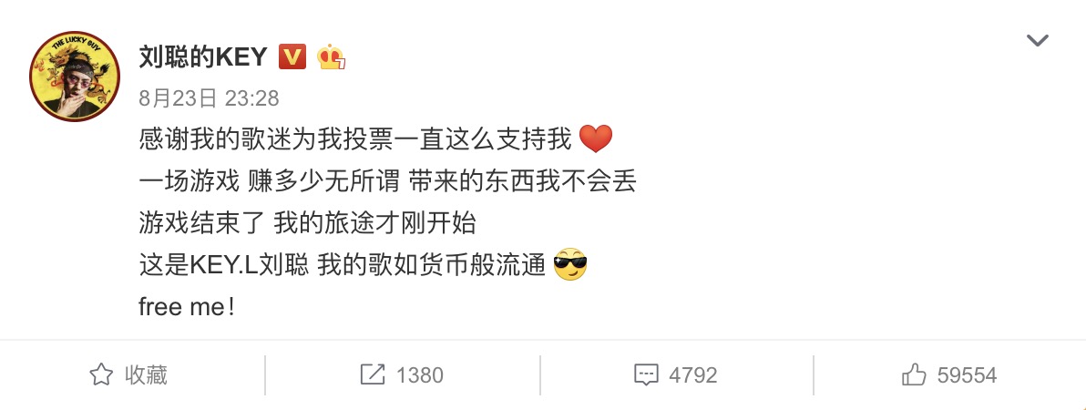 而劉聰在23號晚間也發文:「感謝我的歌迷為我投票一直這麼支持我,一場遊戲 賺多少無所謂 帶來的東西我不會丟,遊戲結束了 我的旅途才剛開始」,最後一行更霸氣的寫下他每次自我介紹的詞「這是KEY.L劉聰 我的歌如貨幣般流通」,而他被淘汰後也令許多粉絲感到非常不捨。