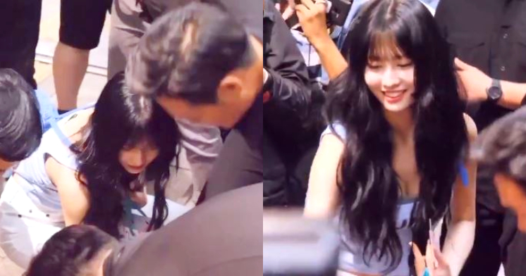 而就在TWICE離開出境大廳準備搭車離開的路上,也有不少粉絲到場接機手拿各式應援牌和小禮物要送給成員,就在Momo準備上車前,一名粉絲的牌子意外掉到地上,Momo見狀馬上彎腰替粉絲和幫忙的保全撿起掉落物,當天穿著低胸上衣的他,因為害怕走光也將手遮住胸口才彎腰,不過起身時Momo的手一放開,立刻就被看到胸前若隱若現的「Y」字深溝,影片引起網友盛讚到「就算已經走紅了還是好有禮貌」、「最喜歡Momo的笑容了,真的好甜」、「是我心中的天使」。