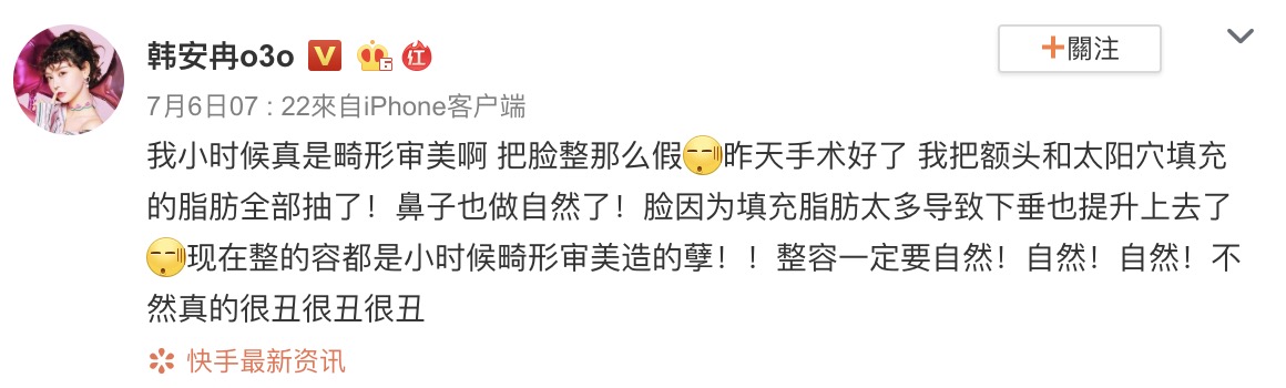 然而韓安冉過去因整形多次而出名,在7月6號時她在微博上發文表示自己把額頭和太陽穴的填充物全都抽掉,鼻子也再次重建,隔不到幾天的時間她就曬出重整的成果照,並發文寫下:「帶著膠帶鼻甲板巨難受,我這種混合T區油皮全是油!癢死了!術後5天了!我把甲板拆了膠帶撕了!山根還是好腫好腫!但是鼻頭真的有點好看哈哈哈 」,她也表示這次重新整形是因為小時候的審美觀太畸形,把整張臉整的太不自然了,所以才會再度進行維修。