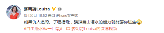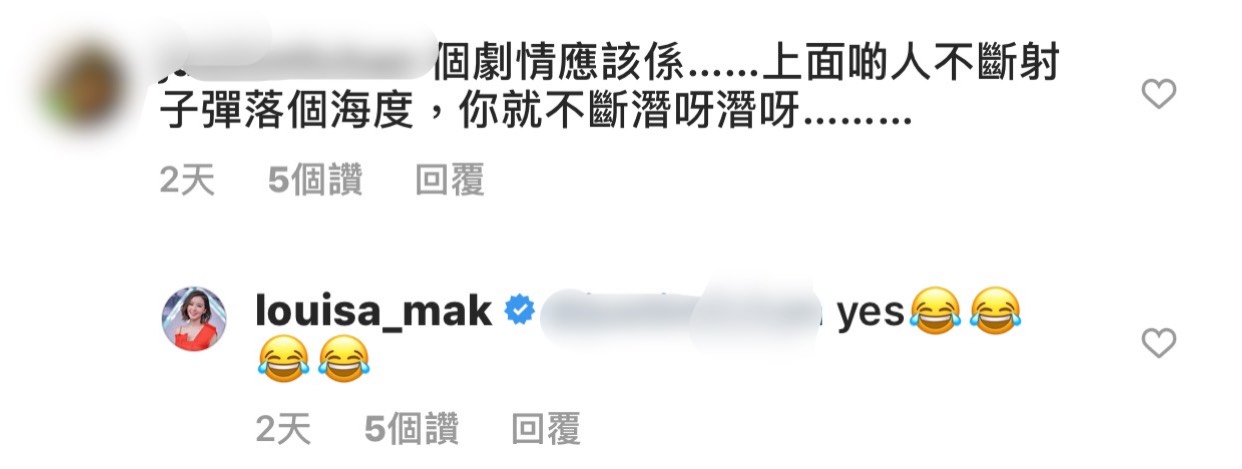 整段影片不是在於麥明詩的潛水技巧如何,而是在她的「優質臀」,讓人看了臉紅心跳。麥明詩也逗趣的寫道「如果仇人追殺、子彈橫飛,聽說自由潛水的能力就能讓你逃生(笑臉)」另外更有有網友表示:「個劇情應該是……上面的人不斷射子彈,你就不斷潛呀潛呀……」,對比近日警方對付示威者亂開槍,而麥明詩則回:「yes」和兩個笑到喊的emoji公仔作為回應。