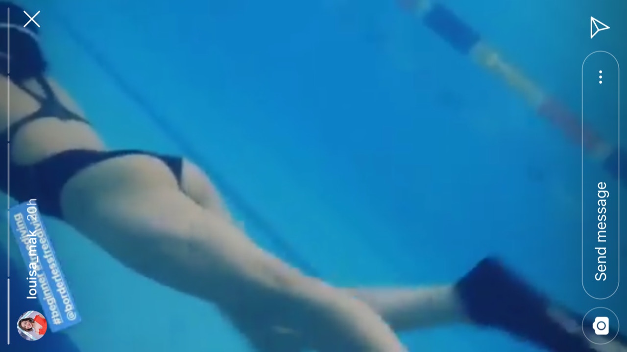 把目光移至下半身,纖細的雙腿在水中一覽無遺,到泳池底部時,麥明詩一個轉身奮力往回游,踢腿的動作讓整個身體的線條更加明顯、修長。麥明詩也曾在7月4日,發出一張潛水照,寫道:「有一些人害怕潛水,怕碰到鯊魚,但其實鯊魚不喜歡吃人類,是因為他們感到害怕而自衛,盡情的享受海洋的寧靜與絢麗吧!」,時隔一個多月,麥明詩從水肺潛水晉升到自由潛水,可以看出麥明詩對於運動十分熱衷。