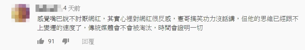 影片一出,有大批的網友並不領情,紛紛揚言要退追展榮和展瑞的頻道,有網友表示「感覺嘴巴說不討厭網紅,其實心裡對網紅很反感,憲哥搞笑功力沒話講,但他的思維已經跟不上變遷的速度了,傳統媒體會不會被淘汰,時間會證明一切」。