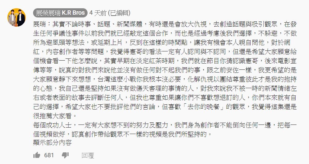 頻道底下大量的留言讓展榮和展瑞也出面緩頰,留言表示對他們而言,憲哥並沒有對不起他們,並提到「其實不論時事、話題、新聞媒體,有時還是會放大仇視,去創造話題與吸引觀眾,在發生任何爭議性事件以前我們就已經敲定這個合作,而也是經過考慮後我們選擇,不躲避,不做所為避風頭等想法,或延期上片,反倒在這樣的時間點,讓我有機會本人親自問他,對於網紅,內容創作者等等問題,我覺得憲哥的看法一定有人認同與不認同,但還是希望大家願意給個機會看一下他怎麼說」,盼觀眾中立思考。