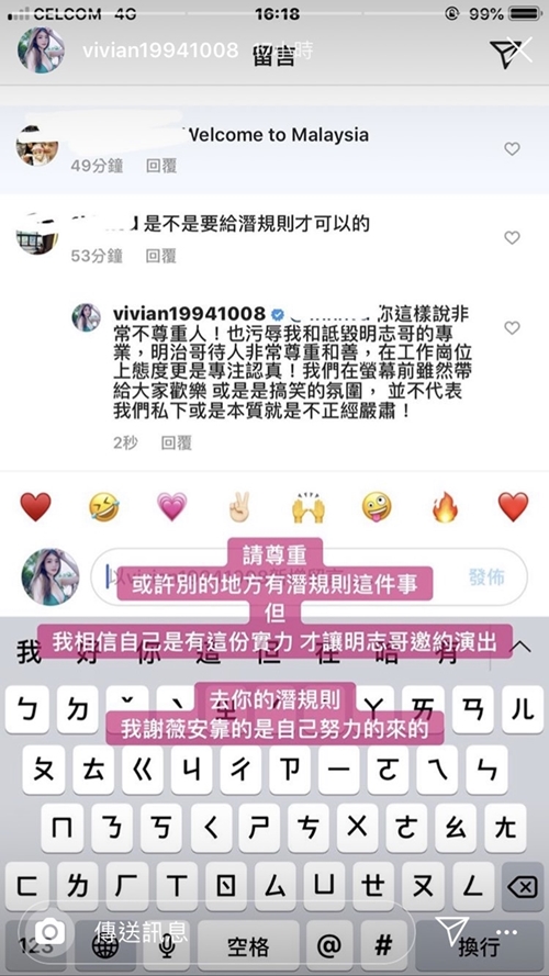 回應之後,謝薇安也將該則留言截圖轉發到限時動態,希望大家能夠「尊重」,或許別的地方有淺規則這件事,但是她相信自己是靠實力,才讓黃明志邀約演出,最後爆氣直言「去你的淺規則,我謝薇安靠的是自己努力得來的」!