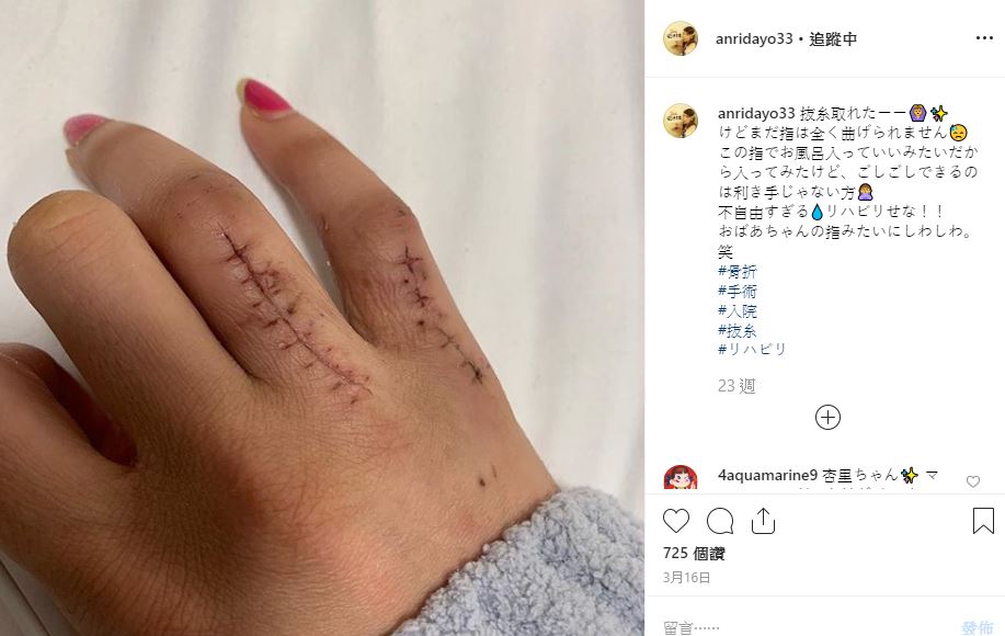 事實上,此前,坂口杏里就在個人IG曝光手指骨折見血的照片,他在文中解釋為了向前男友追討計程車錢才逕自闖到家中。畫面中可見,坂口杏里的左手無名指和中指都腫得很厲害還沾滿血跡,雖然照片已經刪除,不過當時網友見狀都擔心表示「趕快去報警」,今年3月坂口杏里的右手也曾經骨折,花上3個月時間休養治療。