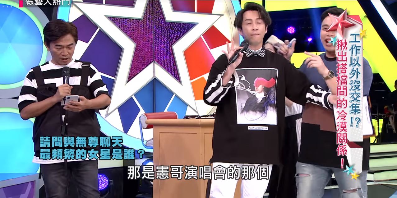 無尊近日和Eason一同參與《綜藝大熱門》的錄製,兩人在默契大考驗的環節時,被問到無尊私下最常聯絡的女藝人,Eason爆料是「成語蕎」,無尊當場被突襲手機,吳宗憲好奇靠過來檢查,結果意外又被發現有一個「憲哥討論群」的群組,憲哥看了一氣之下怒飆髒話,無尊趕緊解釋,群組是為了5月時吳宗憲的在高雄的演唱會表演創立的,憲哥甚至還氣到差點跌倒!