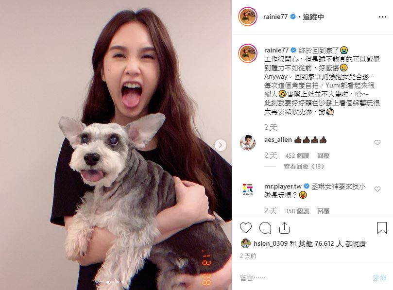 日前楊丞琳收工後,回到家抱起愛狗合照,只見她和女兒都開心地吐著舌頭,直說自己工作很開心但睡不飽,體力已經不如從前,「回到家立刻強抱女兒合影,每次這個角度自拍,Yumi都看起來很龐大,實際上她並不大隻啦!」