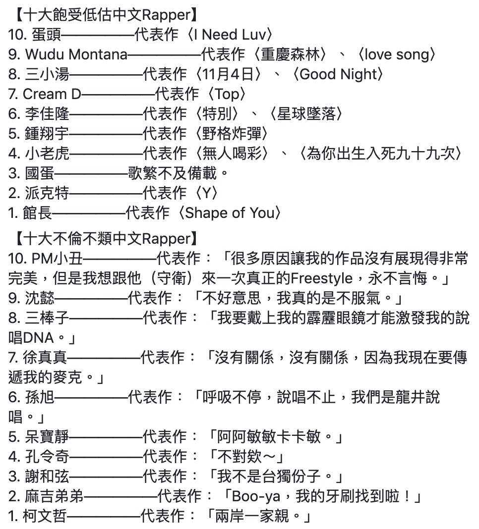 另一個榜單「十大不倫不類中文Rapper」當中出現的10位都是網友討論度非常高的人,stu sis更貼心的將代表的一句話寫出來,像是在本屆新說唱中搶盡風頭的「PM小丑」獲得了第10名,在節目中他因為一句「我想用Freestyle贏他」並且爆哭的模樣引發討論。而在《中國有嘻哈》因為超尷尬的Freestyle而出名的徐真真也榮獲了第7名,代表的句子便是「沒有關係,沒有關係,因為我現在要傳遞我的麥克。」,其他像是呆寶靜、孔令奇、麻吉弟弟也在榜上。