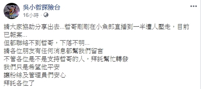 直播主「吳小哲」經常在粉絲專頁開直播探險,日前他到「小魚郎冷凍海鮮」幫忙直播,沒想到播一半出去打電話人就沒再回到畫面中,讓收看的粉絲十分緊張。數小時之後,粉絲專頁「吳小哲探險台」再更新消息,指出吳小哲遭人打成重傷,正在醫院進行治療。