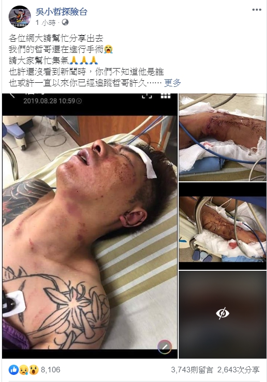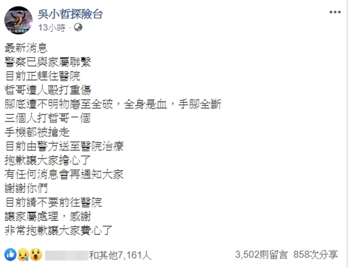 事件發生大約6小時後,「吳小哲探險台」終於更新最新情況,指出吳小哲遭人毆打重傷,腳底遭不明物磨至全破,全身是血,手腳全斷,已由警方送至醫院治療,而目前警方也已鎖定三名嫌犯,積極偵辦當中。
