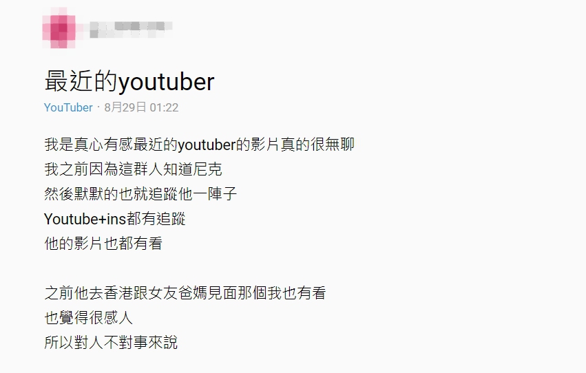 發文者在文章中表示,雖然自己以前蠻喜歡尼克,但是因為尼克近期的影片有騙點擊率的嫌疑,所以已經退了尼克追蹤,並進一步解釋尼克之前還到Ashly香港家中向對方父母承諾會好好照顧Ashly,結果現在又在影片中的標題打上「分手危機」,讓他有「身邊三不五時愛鬧分手朋友」的既視感,並稱「如果YouTube也開始走這種路線,真的就不會想追蹤」,讓網友打趣「看來你需要老高」。