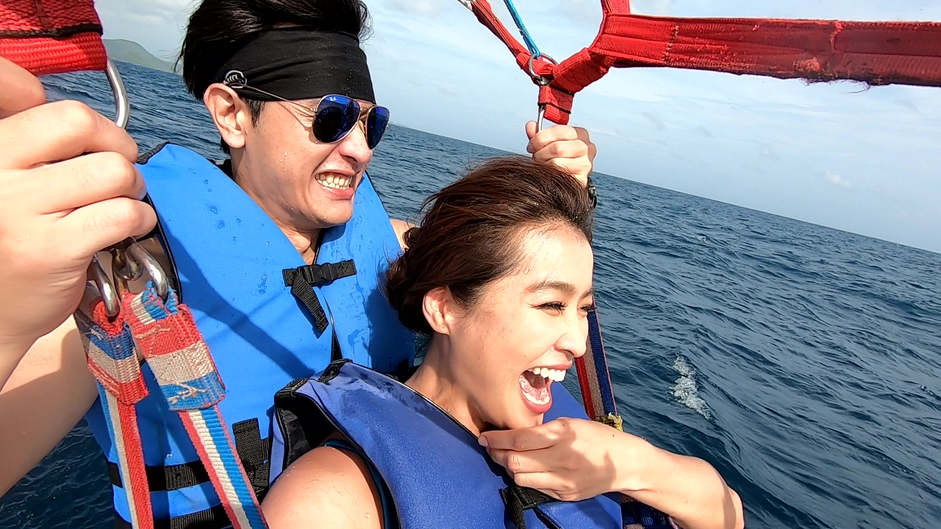 本周即將播出的《綜藝新時代》來到墾丁拍攝,其中一個關卡要體驗刺激的「海上拖曳傘」,輪到小嫻和張勛傑時,浩子還化身愛情小天使,在一旁鼓吹說:「這兩位要愛的飛高高唷!」小嫻在拖曳傘上也不斷誇獎張勛傑的胸膛很結實、很好躺,兩人飄在海上吹著海風,在氣氛的催化之下浪漫滿點,沒想到兩人竟然「踩線」,就在海上親了起來,愛情未達友情已滿的節目效果,讓浩子看得驚聲尖叫,還立刻當起「見證人」。