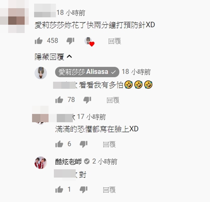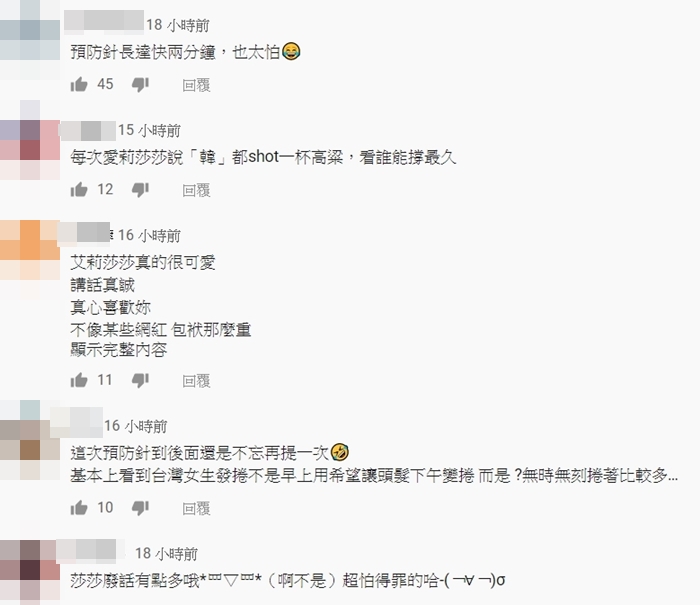 影片一出後,網友們也發現「預防針打很深」,紛紛留言表示,「我覺得莎莎開場也太可愛~~~ 很怕被罵」、「愛莉莎莎妳花了快兩分鐘打預防針XD」、「預防針長達快兩分鐘,也太怕」、「這次預防針到後面還是不忘再提一次」。愛莉莎莎也親自回復其中一則留言笑說,「看看我有多怕!」
