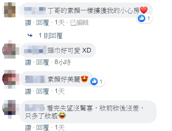 影片一出,馬上有粉絲告白「丁哥的素顏一樣擄獲我的小心房」、「素顏好美麗」、「看完失望沒驚喜,妝前妝後沒差,只多了妝感」、「不用化妝也好看 素顏素起來!!」「 素顏最真!」並稱讚「素顏超小朋友的」。