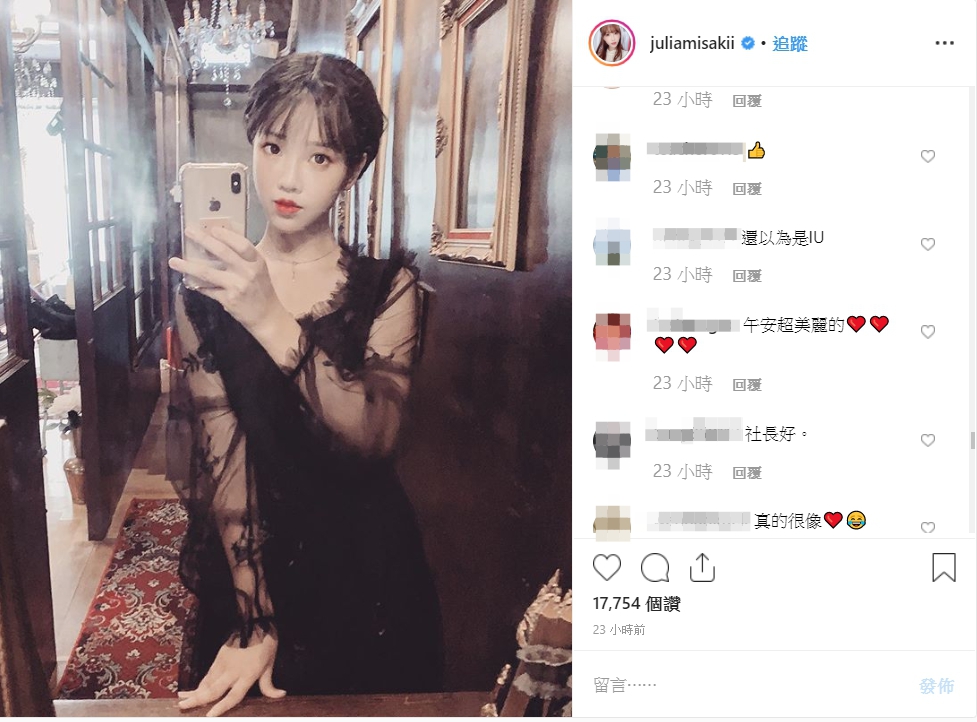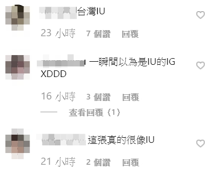 這張神似IU的照片讓粉絲紛紛大讚「台灣IU」、「一瞬間以為是IU的IG XDDD」、「這張真的很像IU」、「剛看到還以為是IU」「想說IU什麼時候開始學中了」,但也有粉絲認為照片修過頭,表示「修的不像妳了」。