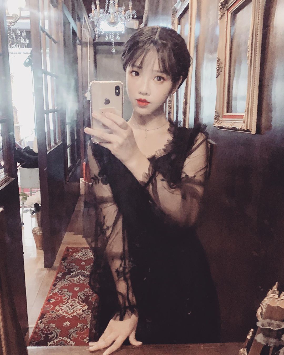 咪妃在29日時分享一張自拍,表示自己今天拍攝的場景風格和造型都相當神似IU近期主演的新戲「德魯納酒店」中的樣子,並笑稱「脾氣也蠻像的(笑死),今天攝影師一直說我殺氣好重哈哈哈」,照片中的她皮膚白皙、臉蛋小巧,有一張櫻桃小嘴,梳著一頭空氣瀏海,將頭髮全部盤起,穿著一身黑色蕾絲袖連身裙,看起來像在某個古堡內對著鏡子拍攝一般。