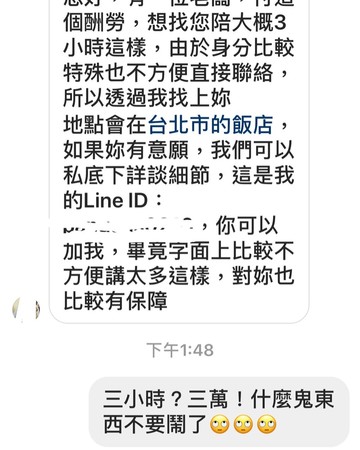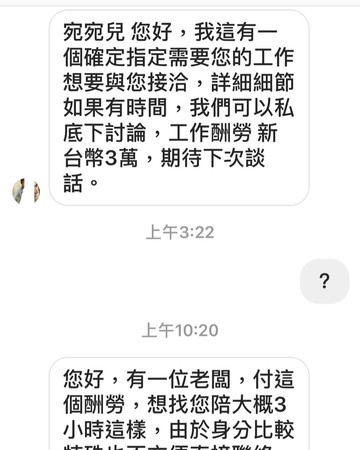 宛宛兒在社群軟體上透露,自己最近收到一封私訊,對方先表示有一份「指定需要您的工作」,開出3萬元的價碼,並表示有時間可以私下討論細節,而當宛宛兒回覆一個問號之後,對方便透露是一位老闆想在台北市的飯店找她陪3小時,但是由於身分比較特殊,不方便直接聯絡,所以透過他找上宛宛兒,還表示有興趣可以加通訊軟體聯絡,因為「字面上不方便講太多,對宛宛兒也比較有保障」,宛宛兒見狀,直接霸氣回復「什麼鬼東西,不要鬧了!」。