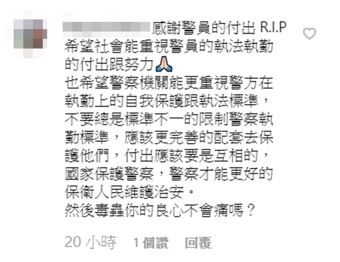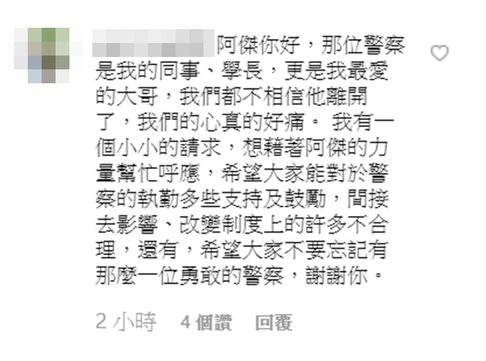 留言中也有薛姓員警的同事現身表示,「阿傑你好,那位警察是我的同事、學長,更是我最愛的大哥,我們都不相信他離開了,我們的心真的好痛。我有一個小小的請求,想藉著阿傑的力量幫忙呼應,希望大家能對於警察的執勤多些支持及鼓勵,間接去影響、改變制度上的許多不合理,還有,希望大家不要忘記有那麼一位勇敢的警察,謝謝你。」
