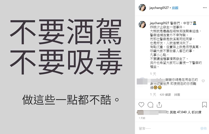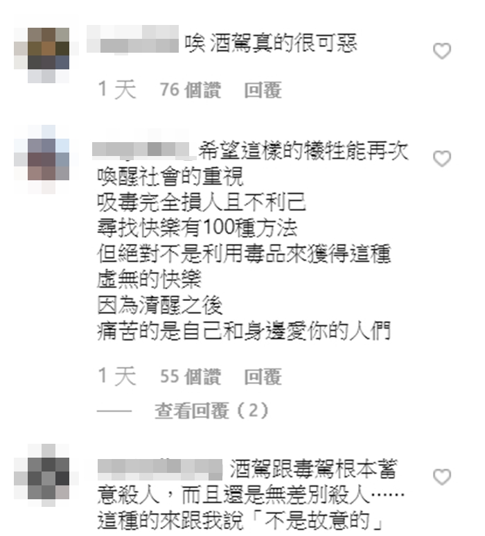 貼文一出後,立刻引來網友共鳴紛紛留言,「R.I.P警察真的很辛苦」、「酒駕真的很可惡」、「希望這樣的犧牲能再次喚醒社會的重視」、「酒駕跟毒駕根本蓄意殺人」、「希望可以讓警察多一點安全」。