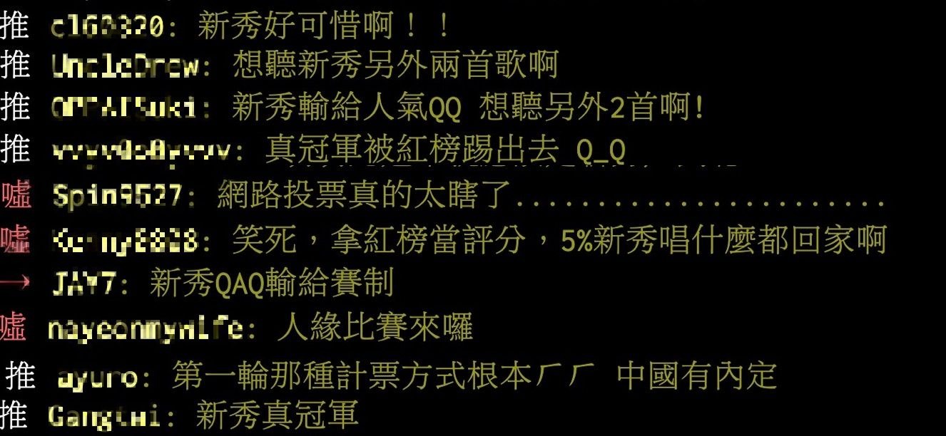 現場投票再加上人氣投票榜數值的賽制也引起許多網友質疑,大家紛紛認為這樣的賽制非常不公平,在PTT討論區中掀起一陣熱議:「新秀輸給人氣QQ 想聽另外2首啊!」、「真冠軍被紅榜踢出去」、「新秀QAQ輸給賽制」、「笑死,拿紅榜當評分,5%新秀唱什麼都回家啊」、「網路投票真的太瞎了」、「第一輪那種計票方式根本ㄏㄏ 中國有內定」,更被網友冷酸根本是「人緣比賽」,引起許多不滿。