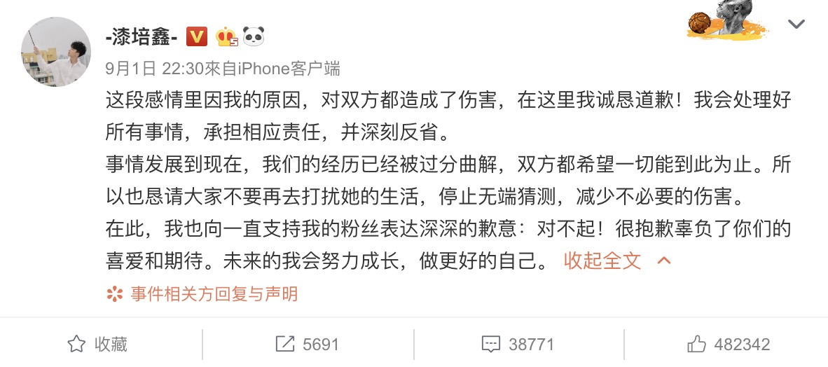負面消息不斷被爆出後,漆培鑫在昨日(1)發文寫下:「這段感情裡因我的原因,對雙方都造成了傷害,在這裡我誠懇道歉!我會處理好所有事情,承擔相應責任,並深刻反省。」,而對於前女友的種種指控,漆培鑫也解釋:「我們的經歷已經被過分曲解,雙方都希望一切能到此為止」,並懇請大家不要再去打擾他前女友,最後漆培鑫也向粉絲們深深致歉,也承諾未來會努力成長,成為更好的人。