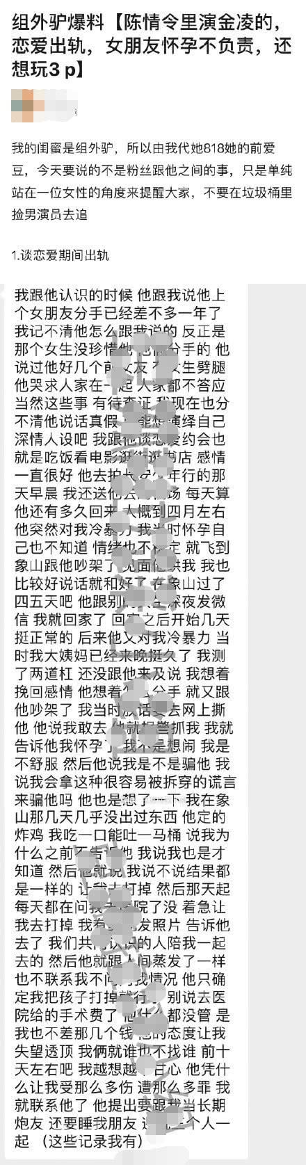 近期大陸非常熱播的古裝劇《陳情令》捧紅了兩位男主角:王一博與肖戰,戲劇中的配角演員們也隨著戲劇爆紅而打開知名度,其中飾演金凌的男星「漆培鑫」外型非常帥氣,在劇中精湛的演出也獲得許多粉絲愛戴,但是近日他卻被前女友爆出在談戀愛期間出軌,甚至當女方懷孕時漆培鑫要求墮胎,面對種種負面的指控漆培鑫在昨日(1)終於發文承認,也對外致歉。