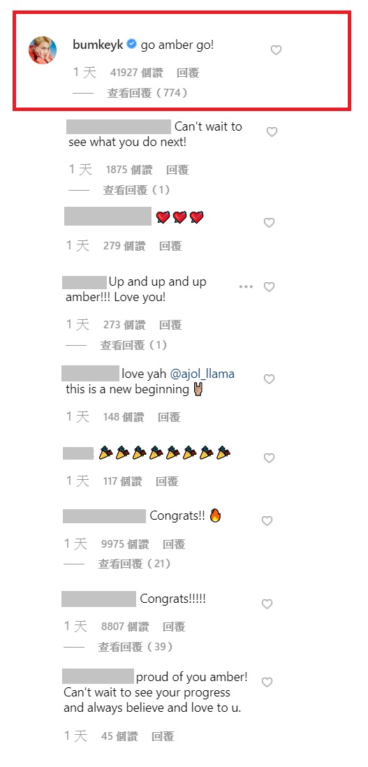 儘管心中有著許多的不捨和無奈,但粉絲們仍舊給予Amber無限的祝福和支持,並留言表示「愛你,這是新的開始」「Amber恭喜」「期待未來的你」,而同公司的師兄團SHINee中的Key也現身給予Amber暖心的祝福,期待著未來更活躍的Amber。