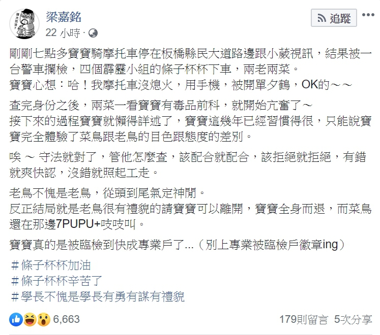 日前,梁嘉銘發文表示,自己七點多時騎摩托車停在板橋縣民大道路邊跟小葳視訊,結果被一台警車攔檢,四個警察一起下車,讓他心想,自己機車沒熄火用手機,被開單活該,「OK的~~」接著他進一步表示,四個警察中「兩老兩菜」,而在確認完身分之後,「兩菜」發現梁嘉銘有毒品前科,「就開始亢奮了~」。