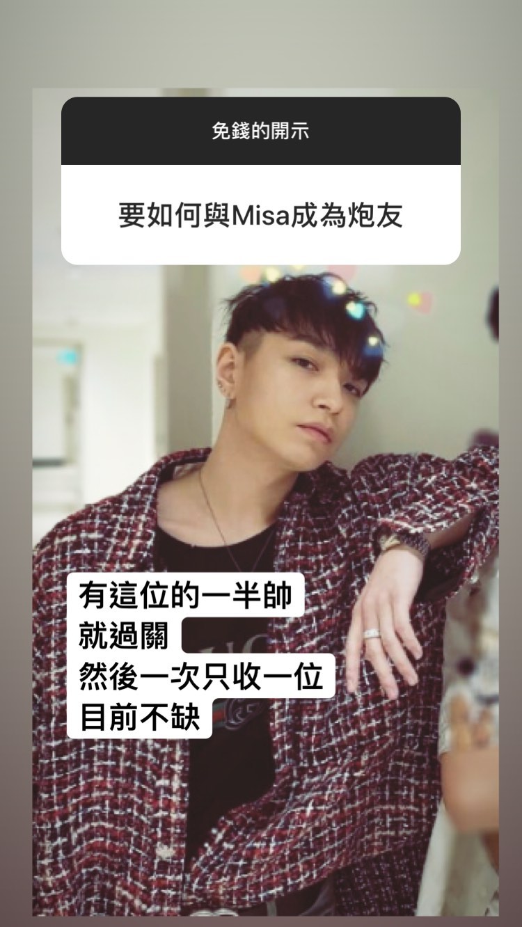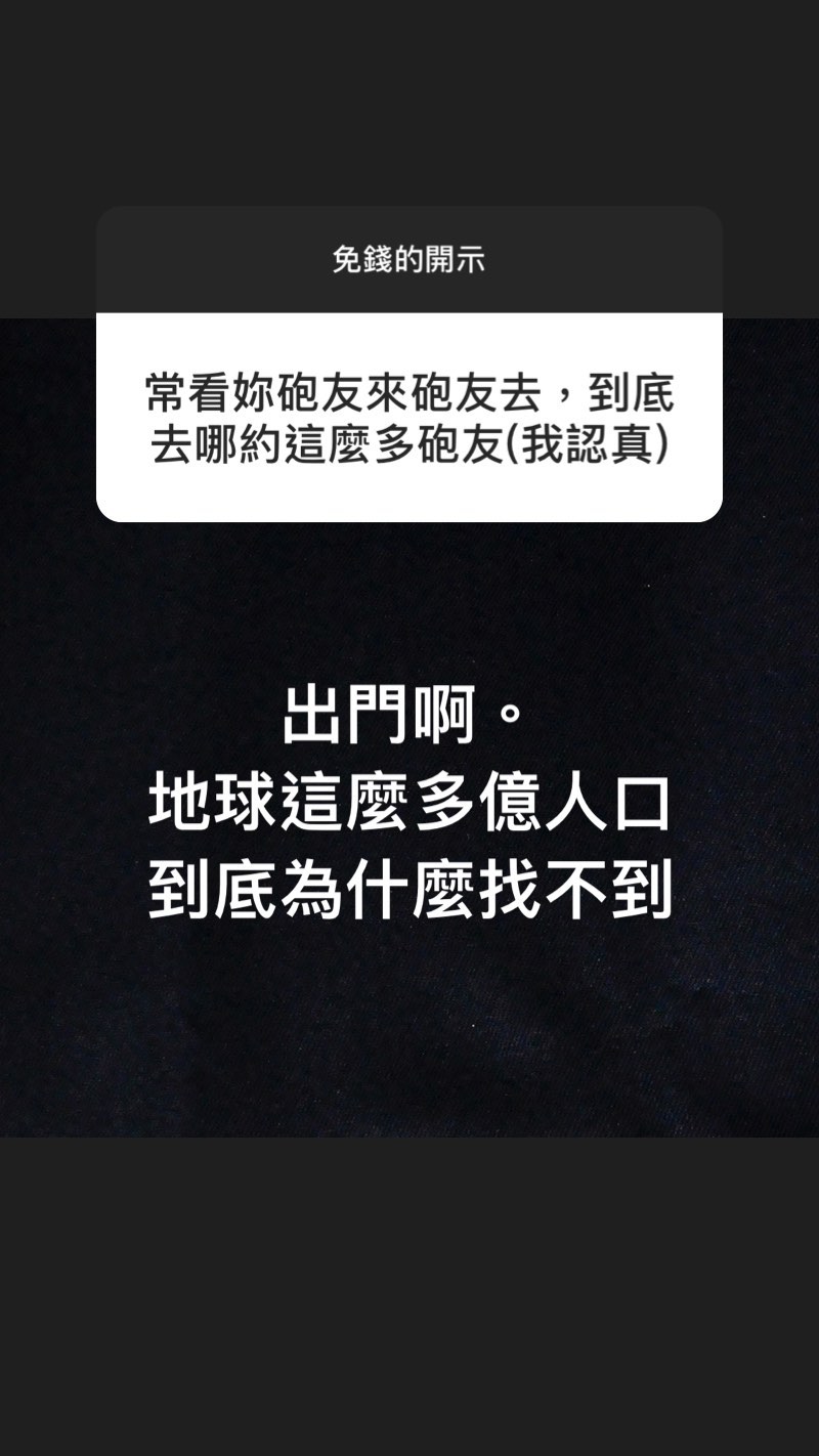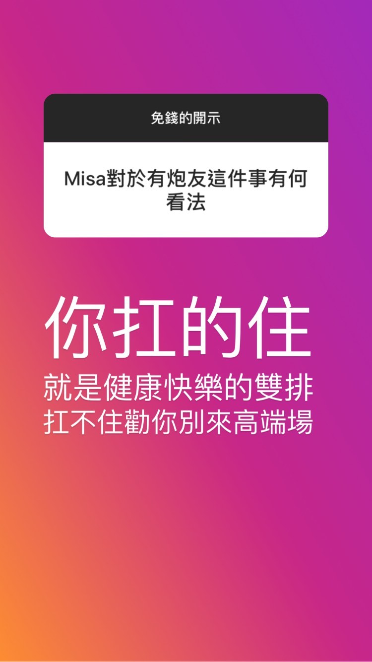 除此之外,也有網友好奇提問米砂對於「炮友」的看法和要如何「和米砂成為炮友」,讓米砂解釋「你扛的住」為主,並進一步表示自己認為打炮就是健康快樂的雙排,扛不住「勸你別來高端場」,並po出一張男子的照片,稱「有這位一半帥就過關,然後一次只收一位,目前不缺」暗示自己目前撲朔迷離的感情世界,也勸性事不合的網友快分手,因為「會提問代表介意到不行,不喜歡就別勉強」。