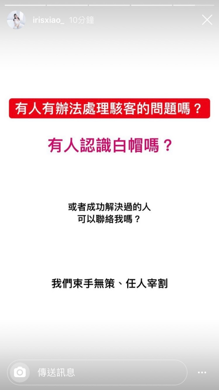 同時閃亮亮也向粉絲們求救,希望有人能介紹可以處理「駭客問題」的人,崩潰表示自己「束手無策、任人宰割」。最後閃亮亮再貼出一張截圖,內容是和男友對話中滿滿的「愛你」訊息,由於包包的帳號被刪除,這些訊息回憶也跟著變樣,讓閃亮亮無奈大喊「還我包包!我覺得憂鬱get」。