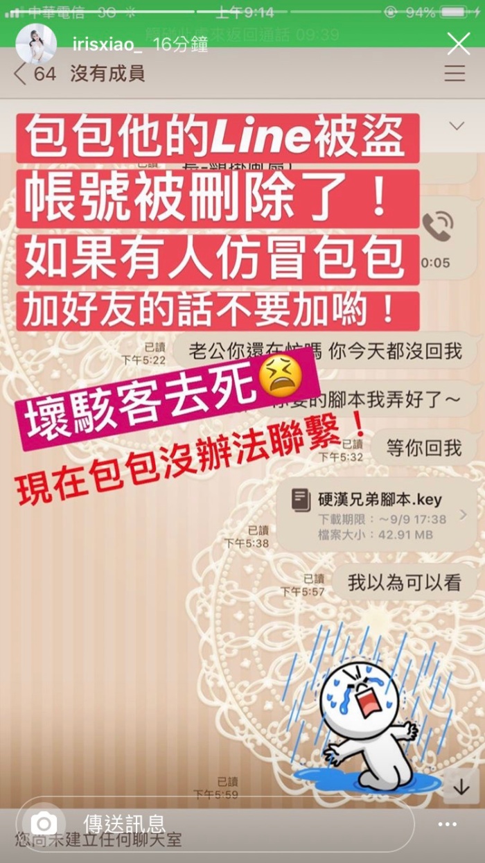 今天「閃亮亮」在Instagram限時動態指出,男友「黃包包」的Line帳號被盜刪除,直呼包包沒辦法聯繫!而背景截圖照也能看出閃亮亮私訊黃包包被已讀,卻始終沒有回覆,讓她十分緊張。