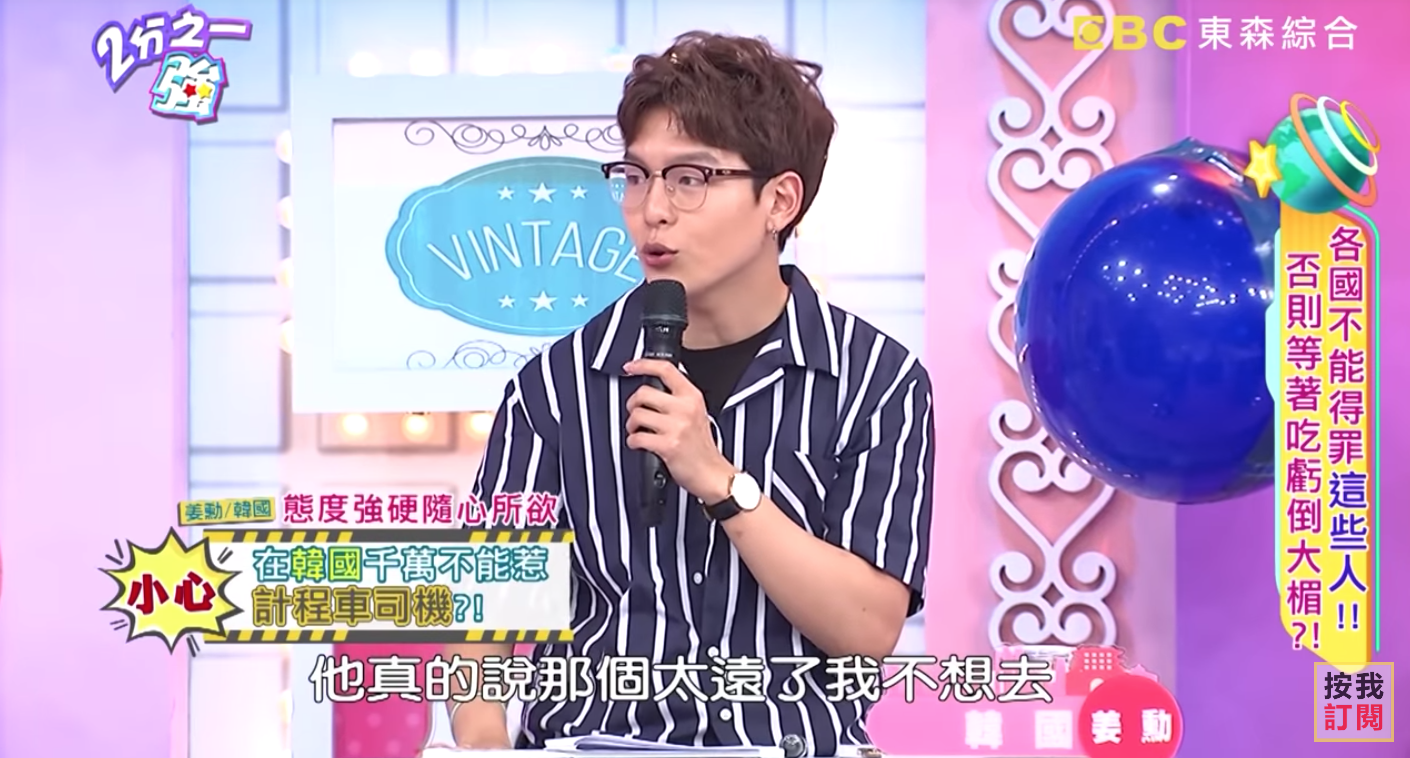 同樣來自韓國的節目班底姜勳也非常認同蘿莉塔所說,他表示,有一次從弘大攔了一輛計程車要到梨泰院找朋友,結果計程車司機竟回覆:「太遠了我不想去!」讓他超傻眼,「我就覺得,你是要賺錢的耶!」連韓國人都認證韓國的計程車司機不好惹,也讓在場來賓直說,「這樣聽起來,台灣的計程車司機算人很不錯。」