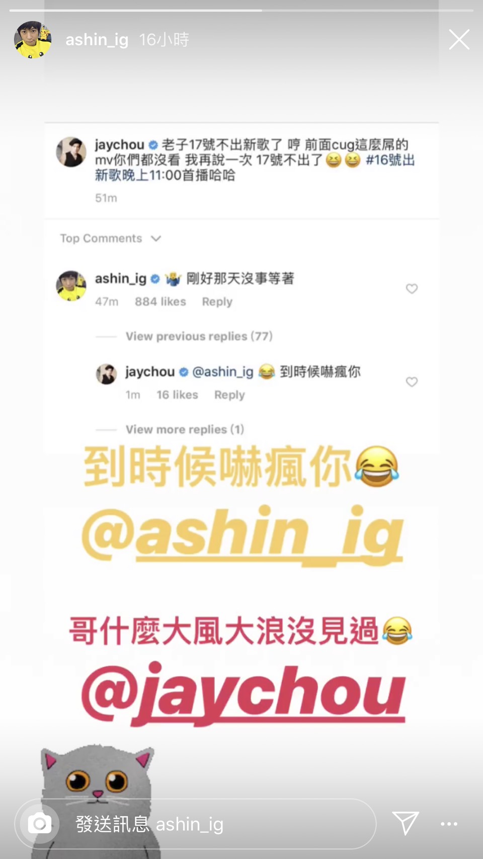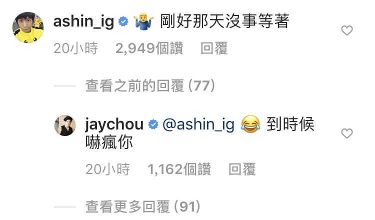 放話的貼文釋出後,意外地釣出阿信本人的回應:「剛好那天沒事等著。」周杰倫則開玩笑地回:「到時候嚇瘋你!」阿信更幽默的回覆:「哥什麼大風大浪沒見過!」還截圖放到限時動態標記彼此,兩人私下友好的互動也讓許多粉絲相當的羨慕。