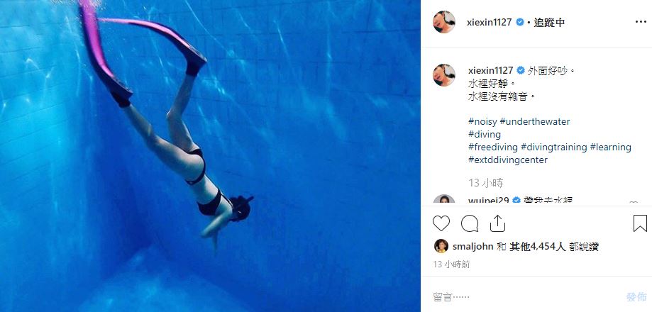 謝忻近來經常在IG發文,前兩周分享了他在國外當志工的心路歷程,昨天深夜,她在IG PO出一張性感的潛水照,只見謝忻穿著黑色的三點式比基尼,仔細一看,這兩個多月暴瘦9公斤的謝忻比過去更為窈窕,不同於過去包緊緊的形象,這次大方秀出好身材,曬出渾圓的屁股蛋,還在貼文中寫著:「外面好吵,水裡好靜。水裡沒有雜音。」似乎闡述著自己的心境。