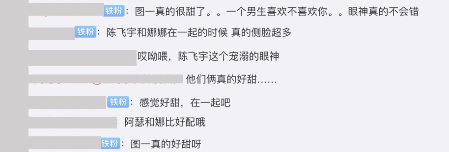 看見兩組對比照之後,網友們也激動的在留言處說道:「一個男生喜歡不喜歡你…眼神真的不會錯」、「陳飛宇和娜娜在一起的時候 真的側臉超多」、「陳飛宇這個寵溺的眼神」、「他們倆真的好甜…」。除了陳飛宇在活動中經常注視著歐陽娜娜之外,有一次為了宣傳電影兩人在螢幕前用吉他彈唱《後來》,合唱的過程中不斷對望,1分鐘內對望了12次。而日前就有網友整理出兩人同款的物品,像是:項鍊、手機殼、玩偶等,兩人互相追蹤後更瘋狂為對方點讚,粉絲們也都很好奇兩人的關係。